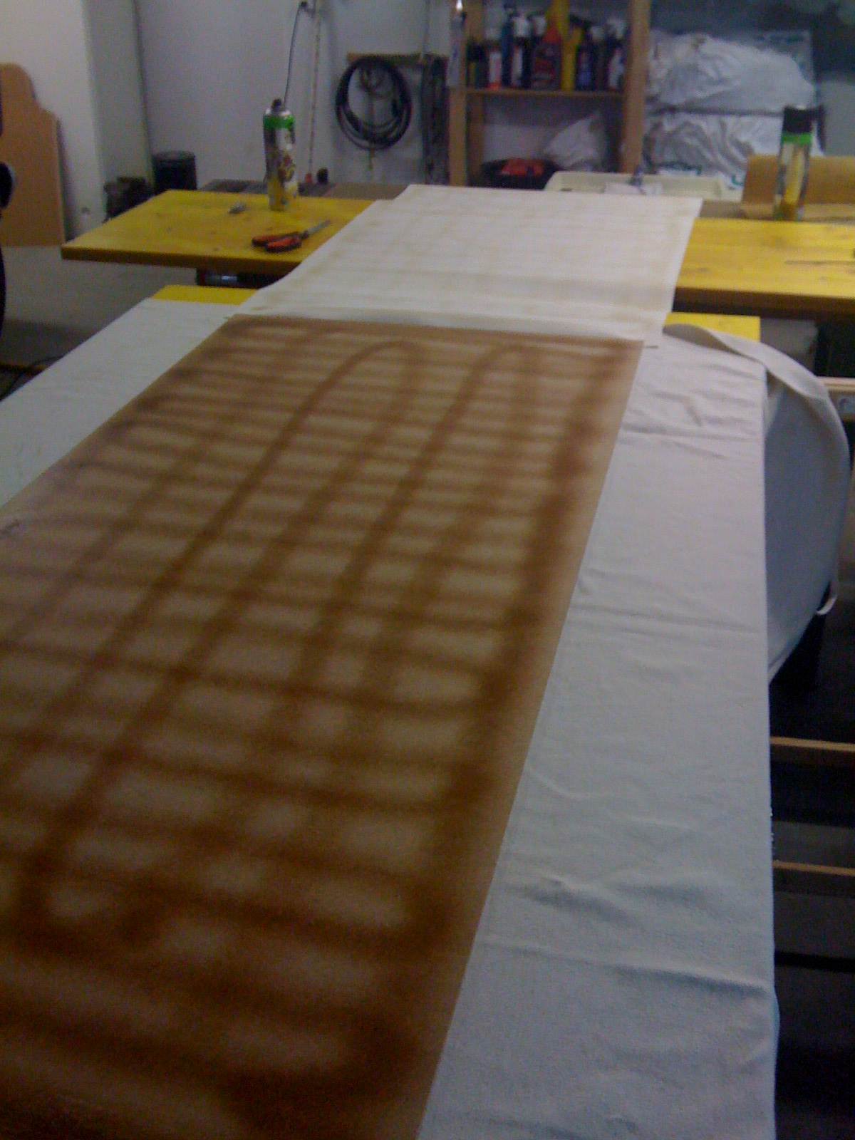 Gestern und heute haben wir insgesamt drei Teile der insgesamt fünf Himmelteile mit Kunstleder bezogen und montiert.