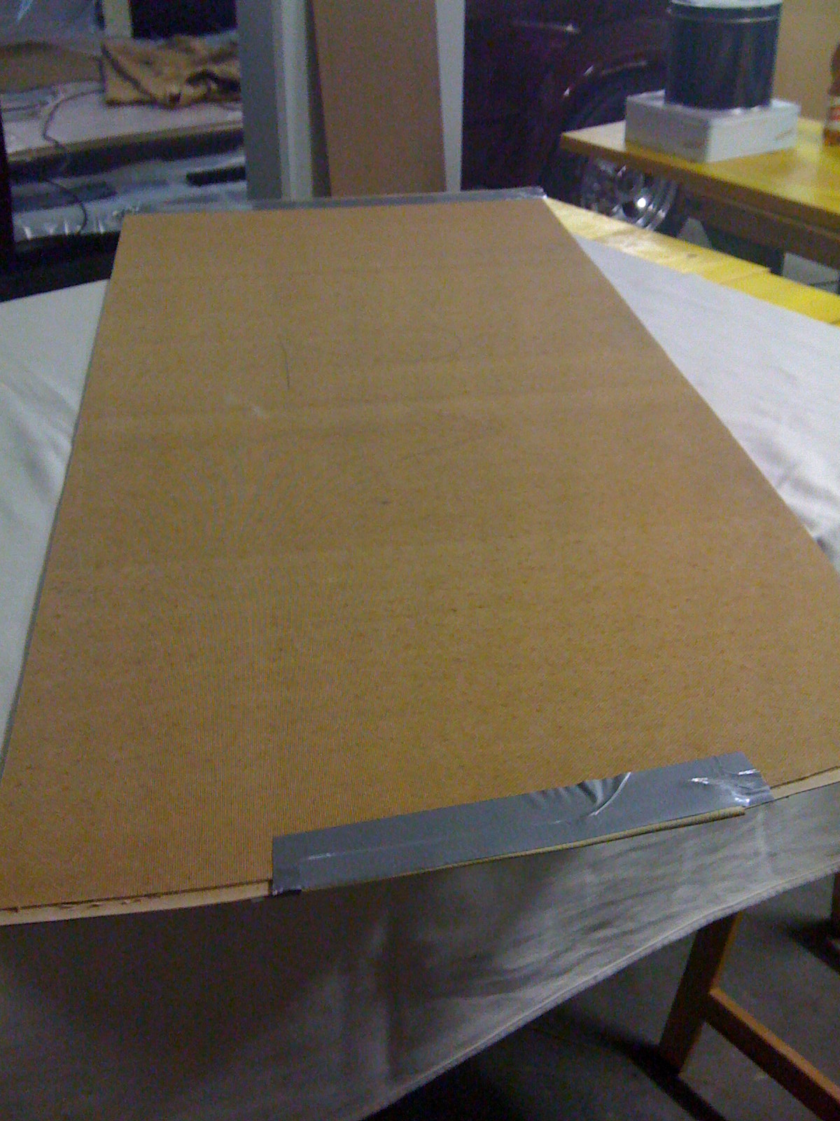 - Dann zugeschnittenes Kunstlederstück für dieses Himmelteil auf einer der schmalen (für die Dachrillen vorgesehene) Kante mit Klebeband befestigen, sodass rund um die Platte gleichmässig Kunstleder hervorschaut für die spätere Befestigung um die Kante.