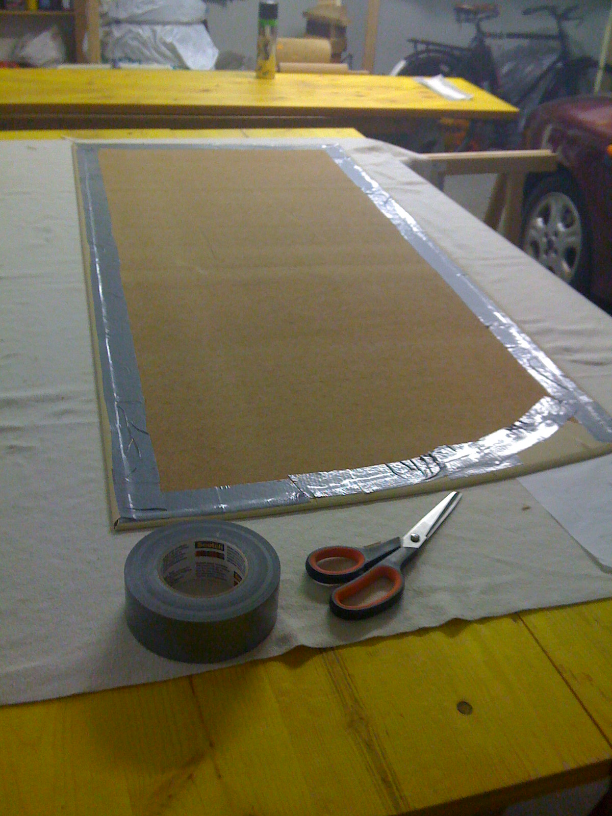 - Das ganze umkehren, sodass das Kunstleder unten liegt, und dann Leder um die Kanten ziehen und mit Klebeband befestigen (Tackern ging nicht weil Tackerklammern zu lange sind, Leimen fanden wir überflüssig weils mit Klebeband ja auch hält)