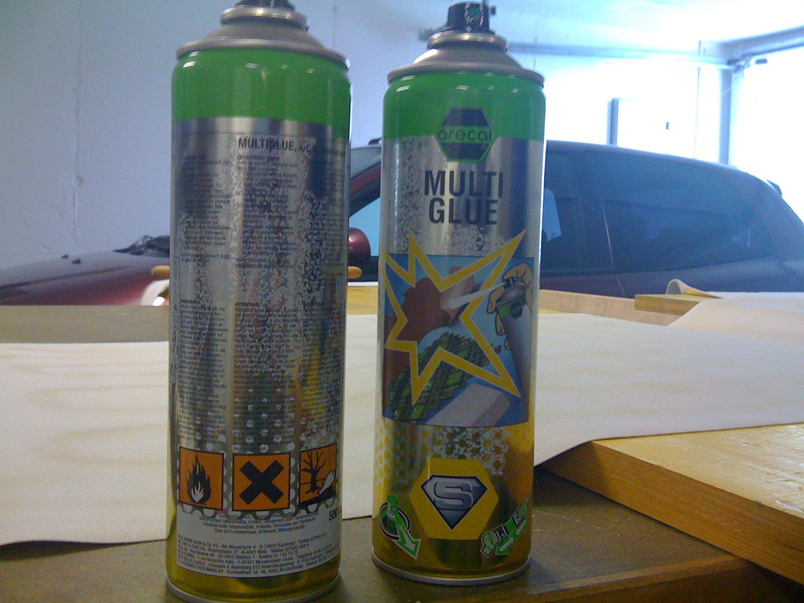 Bei Schneiders Caravancenter Spreitenbach habe ich dazu zwei Dosen Sprühkleber gekauft. Dieser muss nicht mehr so viel Temparatur aushalten wie der Superleim für die Isomatten direkt am Dach (deshalb brauchts hier auch nicht meinen heissgeliebten M3-Spraykleber).