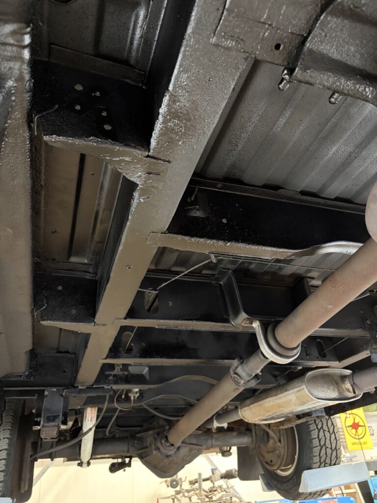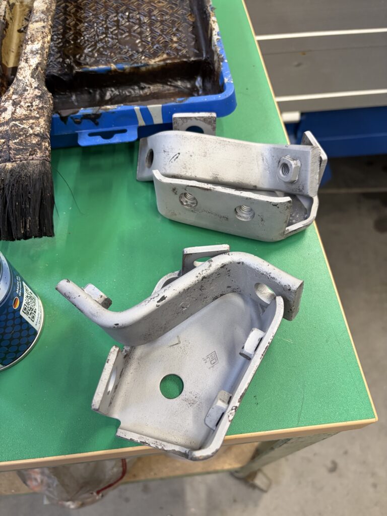 Beim Unterboden also einmal sämtlichen Flugrost wegschleifen, entfetten, mit Noverox grundieren und dann mit Dinitrol 4941 drüber. Ich habs mit Spraydose gemacht. Das geht zwar schneller als pinseln, aber ohne Duschvorhang fürs Auto mache ich das nicht nochmal. Ich sags mal so, auch die Werkzeuge und die Tische daneben rosten nun nicht mehr so schnell.