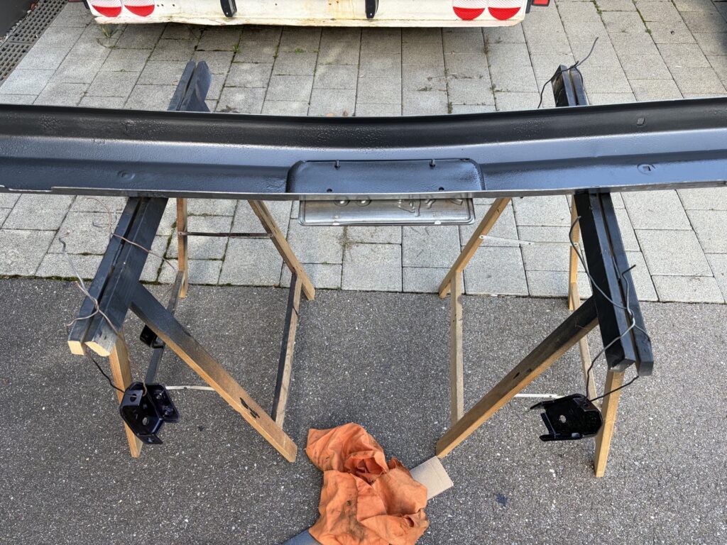 Für die Innenseite der Stossstange habe ich extra Dinitrol RC900 bestellt, also Rostumwandler und Korrosionsschutz. Das hatte ich aber zu dem Zeitpunkt bereits wieder vergessen (ich hätte Politiker werden sollen). Deshalb zum nächst-greifbaren gegriffen: Alpina Hammerschlag: